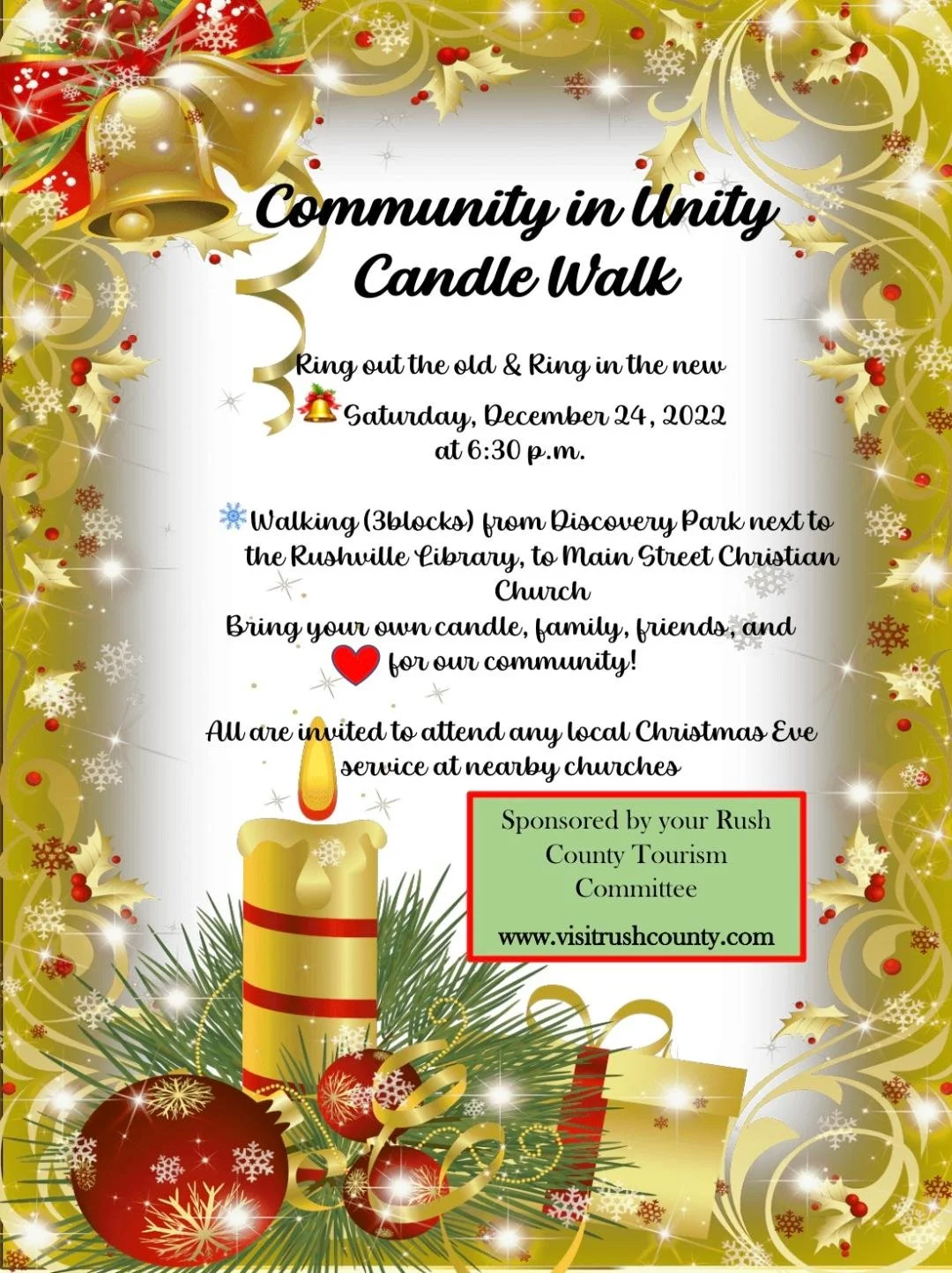 Ring out the old & Ring in the new Saturday, December 24, 2022 at 6:30 p.m. Walking (3 blocks) from Discovery Park next to the Rushville Library, to Main Street Christian Church Bring your own candle, family, friends, and for our community! All are invited to attend any local Christmas Eve service at nearby churches.